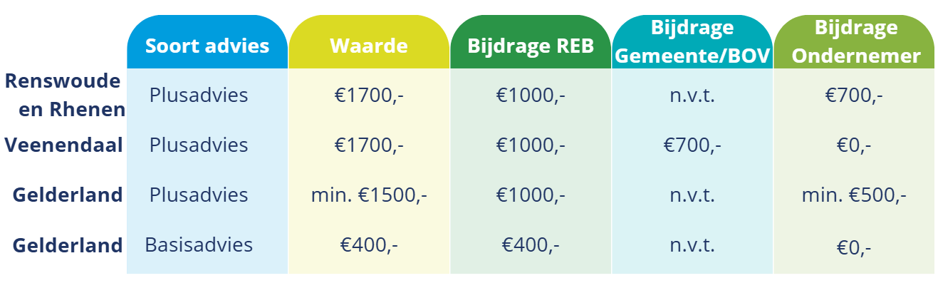 Voor ondernemers in de Utrechtse gemeenten Rhenen en Renswoude is er vanuit het REB een korting van €1000,- beschikbaar op een uitgebreid plusadvies. Er geldt een eigen bijdrage voor de ondernemers van €700,-.