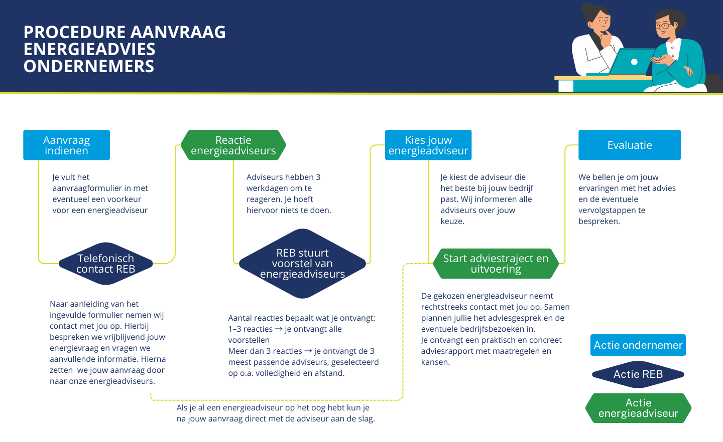 Of je nu een kantoor, werkplaats, winkel of fabriek runt; alle ondernemers in de Regio Foodvalley die hun bedrijf willen verduurzamen, zijn bij ons van harte welkom. Met de energievoucher van het REB ontvang je korting op een professioneel energieadvies. Een ervaren energieadviseur komt bij je langs, bekijkt waar je kunt besparen en stelt een duidelijk plan op waarmee je direct aan de slag kunt.